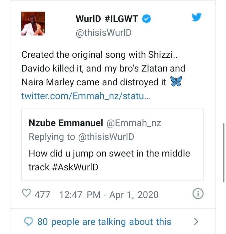 When a fan asked him how he got to be part of Sweet in the Middle, Wurld revealed that he made the original song with Nigerian producer ,